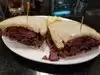 First, the open-faced Reuben is a winner! However, bring the wallet--think $24 for the sandwich, pickle, and slaw. Simple dining area, and we had entertainment from the quirky clientele and workers. Disappointed that there was no pumpernickel in a Jewish deli for my adequate egg salad sandwich. Too many other restaurant choices to return here.