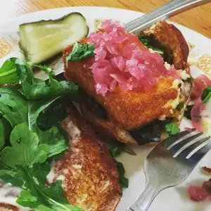 Everything we had here was extremely tasty! The fried polenta sandwich, the jerk chicken sandwich, and cheesecake with blueberry compote were standouts. We will definitely be back to this quirky gem!