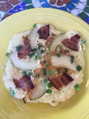 This is a tiny little house with organic food and drinks. It's a local place and has been around for ages. There is inside and outside seating. I drive a truck and while there are a few parking spots at Pacha it's just difficult to park a truck. I ordered their pear/bacon pancake and a coffee. Their pancakes come in both savory and fruity variations. It was really pretty to see- perfectly cut pears and strips of bacon layered onto a pan then the batter poured over the top and cooked. It was an interesting texture- solid-more like an Asian version than the light fluffy pancakes I am used to. But it was very tasty.