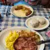 All day breakfast menu with plenty of choice served in basic setting. Cheery waiting staff enhance the experience. I ate steak and eggs. Steak was rare and tender. Fried potatoes and scones with gravy were very good.
