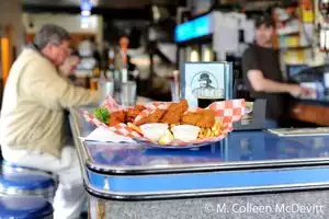 Hole in the wall bar, has 15 stools at the bar where loud 30 something men and a few women watch football game and the Emmy awards on 3 flatscreens. There are 4 booths and 2 small tables and a backroom with a pool table and a very small outdoor deck for good weather dining. Most of the people there appeared to know each other. One of the 2 bartenders took our order for their famous fish and chips with slaw and tartar for 9.99 with 3 rather large delishious pieces of cod. Crispy crust, moist inside, best we have had so far on our vacation. It was rather noisy and for this I deduct half a star. Service was quick and attentive, a 4 1/2 star place.