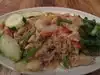 All dishes were authentic Thai, including the spice! Satay portion was small; only 4 pieces but peanut sauce was soooo good. Steak salad & shrimp salad were adequate portion since we split the Satay first. Music was a little loud for lunchtime.