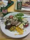 Buffet style at the Farmer's Market. Has a huge selection of sides and salads to go with your meat. Meat is grilled right in front of you and is as delicious as it smells. You pay by the weight of your plate so can put as little or as much as you like. So tasty and fresh that if I lived near here I don't think I'd ever cook again. Market atmosphere going on all around you so very busy on the weekends.