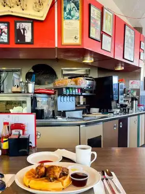 Really enjoyed this iconic restaurant. Great menu with the quintessential chicken and waffles featured, although I had the waffle with eggs over easy. Friendly and efficient staff. We were there a little after the lunch hour and were seated immediately. Perfect place to go when you have left the east coast in the wee hours of the morning and need to start your day all over again on the left coast! GREAT coffee!