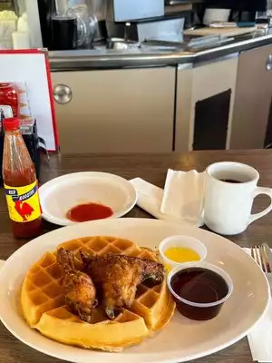 Short drive from the airport, at a busy intersection corner. The place Looks like an old dinner from the outside. Looks like an old dinner from the inside. Even the sign is old school. And that is part of the charm. And the magic is the people that takes care of you. Everyone seems to know everyone. And they are all happy to be here. Sat at the counter for some chicken AND waffles. Not chicken waffles as I was explained from the owner and another gentleman who sat next to me. The food was good, but the people that made me feel so welcomed, as if I been coming for years. Next time I am in town, will definitely be back. For some chicken and waffles, and some of the best smiles/service anywhere.