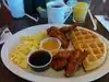 This restaurant has been around for decades. It has the fifties look on the exterior and the interior is spotless. Staff are all friendly and efficient. Waffle and wings are GREAT!