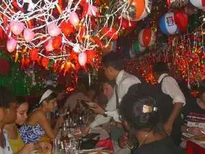 It feels like you are eating in a train car. This restaurant is up some steps and you have to duck when you walk through it due to the hundreds of colorful lights hanging from the ceiling. If you are celebrating a birthday it is great fun when they have a mini light show and play a disco song. The food is good but the atmosphere really makes the restaurant special.