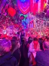 I saw this place a couple of years ago and the lights definetely got my attention so this time had to go! :) sicne there are 4 places in the same m2 a man in each of the places rushes you in so the one in this one got us in saying we will eat in 5min.. he got us to the back of the restaurant (extra tiny and crowded) and we waited standing by the restroom door and kitchen door for 15min at least, then we got our table and had a fantastic meal, the food is great and we got our bottle of wine! People are all havinga blast,a nd at elast 3 birthday parties happening with the singing, etc.. but the waiters kept "pushing" us to finish our meal, gave us free ice cream and brought our check even if we didnt ask for it and the man outside saying "we need the table get out" so that wasnt very nice.. we understand theres a line to come herebut still not a way to treat costumers.. we wanted to stay chatting awhile longer but impossible with the guy standing next to us pressuring us to leave.. but still i would come back for good indian food, nice price and fun place!