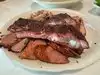 I tried a combination plate with all the meats and a baked potato - side of green beans. The brisket was very dry and had no dry rub to speak of - flavorless. The sausage casing was very elastic/chewy- the sausage tasted cheap. Ham was ok The ribs were just ok - again, lacked a dry rub. The sauces were unrefined. The best parts were the green beans and baked potato. Ate less than a third and gave the rest to a homeless person outside. Disappointed!