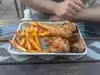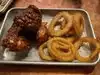 For all the wild shenanigans happening along Fremont Street, it's best to take a break at a restaurant that has hearty food to fill your grumbling stomach. After stopping by Park on Fremont, I highly recommend this to be the place where you get that rest. It is not a silent establishment with a dress code, as there are people chatting it up in casual wear, with music blasting in the background. However, as an introvert with social anxiety, I still found a sense of calm being seated indoors with its dim lighting and dark tones. I preferred indoor dining because of the somber fact that a homeless person was sitting right across from the outdoor tables. The paintings around the room could be a bit off putting, or if you're like me, they'll keep you entertained while waiting for food. If you ever saw the movie, "Poor Things" (2023) then that's the best description I have for what the art pieces looked like. It took a while for a server to take my order, but they were clearly swamped by the influx of customers pouring in, so I took no offense. Just be warned that if you come here hoping to stay briefly, then I suggest you squeeze in extra time. Coming to a food spot along Fremont Street in the evening during summertime (especially on a holiday weekend) you cannot be shocked at the wave of popularity it'll get. Despite the stress of orders, my server remained positive and respectful towards me and the chefs did their thing in making fresh, mouthwatering quick bites. I ordered chicken tenders smothered in sweet chili sauce with a side of onion rings; I also tried their truffle burger and regular fries that was ordered by my partner. The truffle burger stood out to me the most, but everything was just flawless. For the first night is Vegas, this was the perfect meal to indulge in.