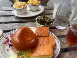 Came here with my fiancée. He is highly allergic to seafood and we were told all their food is fried in the same oil. Sadly he could only enjoy two heaving bowls of Mac and cheese and cornbread. I had the catfish sandwich as well as a side of collard greens. Everything I had was so delicious and fresh. The cornbread perfectly melted before you could even bite into it. Pleasantly pleased with both their home made sweet tea and lemonade. Super friendly staff as well.