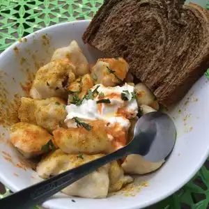 ...before leaving Seattle and it was a lovely way to end my trip. I had the beef pelmeni with the "classic" toppings, which included curry powder and sour cream. The service was quick and the courtyard behind the kitchen was a pleasant surprise.