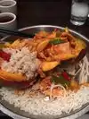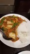 The mango Chicken was displayed beautifully and was quite tasty. I does not come with rice so be prepared to order separately. It's listed as spicy on the menu but was not, in my opinion, spicy. The server did offer to alter the level of spiciness. You receive a large portion so you may be able to share if you don't want to take some in a to go box.