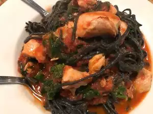 Peppe Rosso serves traditional Italian dishes and is located on a side street in Soho. Always busy at night as they offer very good food at average $10-12 a dish. The pesto pasta is very good as is the broiled salmon with vegetables. Service is fast too.