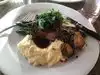 My son and I went there for dinner and the atmosphere. He had the prix fixe menu which had the cold cuts( not good) then baked Brie ( good came with Cole slaw) and we both had the streak frites. For drinks just tap water. I’ve been up since 4 am sick for an hour now on the thrown.