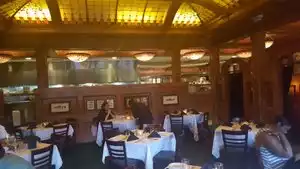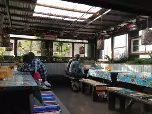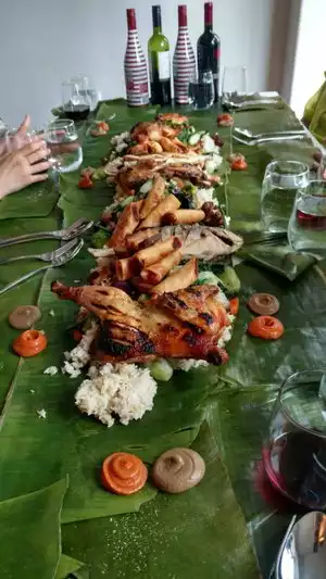 On Sunday all day this restaurant covers all their tables with bamboo leaves and then proceeds to pour your food from a large bucket directly onto the leaves---first a base of rice, then a bucket of vegetables and thenchicken, sausages and a whole fish. Diners proceed to scoop into this mess with their bare hands---no utensild provides--no plates---and enjoy. I personally consider this unattractive dining, and don't enjoy my fellow diners ripping piences of chicken and fish off with their bare hands. Maybe you do and if so you'll enjoy your meal here. Also at about $35 per person it's not really a good value as the food you'll eat is probably worth about $10 in total. Popular with families and some groups.