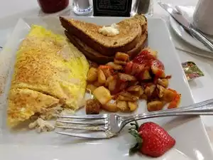 I ordered the vegetable omelet, cut the peppers. The coffee was good, not great, and I am a coffee snob. The coffee mugs here are nonfunctional and frustrating. They do not fit fingers so the mug droops and you either burn the backs of your fingers or spill the coffee. Terrible experience. The meal came with awful seasoned potatoes that were soggy. The best toast was not buttered. The omelet was unbalanced with too much cheese and onions, not enough tomatoes and short on broccoli. They use red onion, and I don't care for it. Yellow tastes much better and is milder. The bacon was just right. I should've ordered lunch. Excellent service.