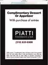 Piatti's was chosen by my children as a place to celebrate an event. There were 7 of us and a baby. Everyone ordered something different and we were all quite happy with the quality of the food. The service was very good except that the waitress must have misunderstood my order and left out the salad. It is a very nice atmosphere being casual but slightly upscale. Prices were very reasonable as the total bill with drinks and tip came out right at $200. Be prepared to walk if you are a customer of the shops or restaurants or you can pull up to the front and use the valet service.