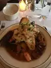Excellent atmosphere. Very cozy, intimate yet comfortable & warm. Great view from our window table. My halibut was unbelievably good. My brother enjoyed his crab cakes and calamari. We both started with a very fulfilling cup of onion soup. Definitely will visit again soon.