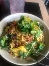 Nice vibe and service. Limited brunch items, with an optional Asian lunch menu. No chai lattes, for tea lovers. Small plates of cauliflower and tofu lacked flavor, but were easily picked up with available sauces. The chow fun noodles arrived late, almost as an afterthought. This dish was served in a âsoupâ of chili aioli, with ultra-sticky flat noodles, bok choy, and cold eggs on top. Cinnamon chai bun wasnât soft, with barely a hint of cinnamon or chai. Disappointing overall but has potential.