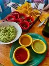 The guac and queso were amazing. We were there during happy hour and the strawberry margarita was very good. Prompt service and beautiful weather to eat outside.