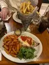 This place had a nice atmosphere. It was quite busy, but we got a table upstairs. I had a grilled cheese, but I can't remember what it came with. (it might be fries) My dad and brother had bangers and mash. My mother had the chicken escalope. All were good.