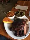 Great place to find ribs! I had the Carolina ribs, 3 pieces with cornbread, a side of cole slaw and their special mac and cheese with green chilis. Delightful combination. Arrive early before the crowds...we arrived around 4:30 on a Saturday and beat the crowd. My friends had the smoked trout and pulled pork. We were pleased with all our choices. Would return again...too full for dessert and had to take home part of our meals.