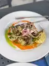 Killer jazz band inside. Nice terrace, but weather was too warm for it. Scallops, pasta with clams, grilled octopus were great. The pasta in vodka sauce was a bit too spicy. I fully reccomend this place.