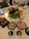 The food is good here, but there are aspects that need improvement. 1. Why does one always have to play table games? Do they really need to try to seat you closest to the station where the line of servers is standing there like players in front of a goal on a penalty kick? 2. If you ask for bread, the server should not trick you into ordering a $28 bread service which includes stale sourdough toast, a tiny thing of mushed eggplant that was inedible, another sweet chili pepper purée and sliced ham cold cults that were also terrible, some cornichons and a slab of butter. 3. The prices are very high so the entrées should come with some accompaniment. I will say the portion of said entrées is a good size. 4. The service is fair.