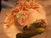 we were in a bit of a rush and the wait staff told us what order that would come right up. my husband a wrap, think it was santa fe - said was very tasty with avocado and nicely prepared chicken, the sweet potato fries were worth getting. I had the vegi chili and it was delicious. lots of menu items to pick from. ah, and we shared a chocolate milkshake which was good, could have been a bit thicker/richer.