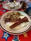 I last came to this joint about 20 years ago so this is my first review. I don't remember anything about that visit because I was probably drunk and with friends, though I do remember the birds. So this place is set up like a bedouins tent, with tables and chairs. Employees dress very casual as it's a very casual atmosphere, however you will see all walks of life and dress styles here, from business people to casual. Waitstaff are all pretty laid back but efficient and friendly. Menu is pretty eclectic. You can do breakfast all day, or sandwich, or burger, or wraps, or a pretty solid blend of different stuff, including some vegan type stuff that I ignore. 😎 Today I had the R-hearty big breakfast which is french toast with bananas, 2 eggs your style, your choice of bacon, ham, or sausage, and some kind of potato hashbrown medley, which is kind of bland but still tastes good. The french toast was made perfect and tasted delicious. Eggs over medium were perfect, ham was good. I also had a side of sourdough toast, that was a pleasant surprise. Wife had chicken curry basil wrap. She wasn't impressed. The curry tasted chalky, there was a bit too much basil to it and the curry overwhelmed the red and yellow peppers and other ingredients, so we wouldn't recommend that. Prices are moderate, but we'll just go to IHOP for breakfast next time. Overall the place has a certain charm to it, parking is adequate, birds outside are cool (Peaches and Cream like their necks scratched, and Sam the Toucan has no interest in anything but he's cool to look at!). I'll probably come back in another 20 years.