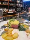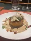 First thought was how charming! Visited around 5:45 pm on a Saturday not crazy crowded! Asked for a seat at the bar! Very accommodating and very nice staff to greet you. Bar was small itself very rustic and comfortable.. they do have plenty of high tops to sit. Maybe 5 -6 people can sit at the bar. The Bartender was very attentive immediately. With a glass of water and both food and drink menu he introduced himself and the two other bartenders working with him. The drink menu has lots to choose from. From craft cocktails to amazing bottles of wine and also Wine by the glass that is affordable. looking around, I realized the espresso Martinis was popular, four of the people around me had ordered them. The menu itself is very diverse from Buffalo, venison, trout caviar, duck, elk and antelope, Alaskan halibut and scallops I wasn’t feeling very adventurous so I stuck crabcake appetizer, and a nice glass of white wine and for dinner, a filet with a nice glass of red (see picture) it was perfection for me. I will go back and sit outside on the beautiful patio and outdoors For the experience the $106. Was worth every penny. Oh and I must mention the rolls, which came in an iron skillet, looked amazing.