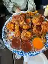 We had such high expectations but were so disappointed. Poor service by the staff, it took a very long time before we even got to order. The staff was disengaged and threw out plates followed by food. We also ordered a bottle of wine that finally arrived at the table warm (white wine). The staff put the bottle on cooling and finally we opened the bottle ourselves as the staff did not care. We ordered the big chicken platter with 20 pieces. Completely tasteless, dry chicken and over fried. We asked the staff to help us call taxis which they never did. They never notified us until the guard came and threw us out. All 4 got bubbly in the stomach after dinner and we were incredibly disappointed with something we looked forward to on our new york trip. Not worth a dime of what we paid, not cheap either. Toilets dirty and overflowing with paper.