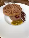 The restaurant is located in an old church/cathedral but from inside you wouldn't know it. We were seated 'outdoors' with the retractable roof/shade which was really pleasant. The rain bucketed down heavily for a short while though and a few guests got dripped on, presumably as the retractable roof had sprung a leak. On arrival you are served an 'amuse glass' which was a lovely cocktail to stimulate the taste buds and then the bread arrived. The cheesy rolls are worth fighting for - they explode in your mouth! We shared a heap of dishes for both starters and mains and everyone was delighted with their options. The scallop serve was reasonably petite but the pork rack was huge and in fact fed me completely and supplemented the meals of two colleagues. The puffed spaetzle was an interesting phenomenon. The burrata starter was delicious as well. For dessert we shared 3 amongst the table and all were great. Would not hesitate to return .. just need the opportunity.