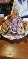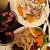 The food is superb. The place is lively with music. Red wine is offered on the house. The rotisserie chicken is their popular dish. The fried seafood comes in small and large servings. The large will feed 6 people. Caution though if there are 2 people they will assume you will order Large so specify. If you order chicken to go cut up and in 2 containers they will charge you for 1/2 chicken twice and will cost more. An order of Chicken is only $10.85 but getting two halves is almost $14. Check you tab all the time.