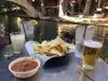 Happy Hour provided us with an opportunity to try a few drinks. Margaritas and beer on the cool patio. Salt rim and sugar rim got mixed up but it was ok. The free nachos and salsa were exceptional for the price point.