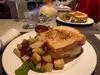We dined here in Sunday evening before Aladdin musical. Arrived at 5 PM. Seated quickly. Server described specials and soup of the day. Our party of four ordered the following entrees: 16 oz prime rib / mashed potatoes,; rotisserie chicken with roasted potatoes and Brussels sprouts; rotisserie chicken salad; and Scottish salmon with roasted beets, carrots and potatoes. Son had prime rib, it was massive, ordered it medium, but arrived medium rare. He said it was awesome. I had the salmon, and it was cooked perfectly. Roasted veggies were very tasty, this is a good meal if you want to avoid overeating before show. The rotisserie chicken is 1/2 bird, wife said it was moist , but wished she had requested the mashed potatoes instead. The rotisserie chicken salad is huge, our person took 2/3 home with her. We had two soft drinks and 2 glasses of wine. Tab came to $144 before tip. Waiter was slow to return with check and carry out boxes. Overall very nice restaurant and high quality food .
