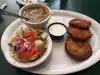 Generous portions freshly made where you can see it. Cornbread and pop ups in a basket come with your entree, no problem asking for extra. I had eaten more than half of my delicious salad before remembering to take photo. Lots of Southern comfort food choices with veggie options. Casual, friendly staff and service. Moderate prices. Popular for take away. Been stopping by since 1991.