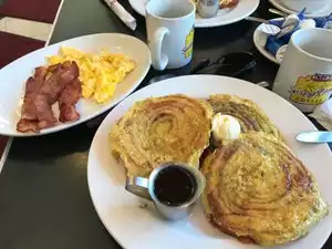 I ripped my shorts when I sat down due to some metal on the corner of my table. I mentioned this to my server. About 5 minutes later the manager turned up and told me that the meal was on the house so I could spend the money on new shorts. That's what I call amazing service. The food was amazing quality. Best breakfast I've had in the US. The cinnamon whirls are amazing. My wife had pancakes with sweet Apple. Huge portions, great ingredients and lots of coffee. We never had to ask for a coffee to up, as our server gave us constant attention. Very cute decor - especially if you are a European tourist like we are. We will be back! Thank you.