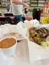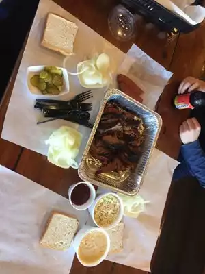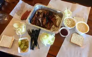 I love to get BBQ to go here. We were hosting a bunch of friends and we all needed to bring a dish to share and we decided to get the brisket and the cream corn. It is very good, and very fast. Their to go orders are easy and you can order the meat by the pound which is nice. Their BBQ sauce is really good also. We used the beef brisket to make some sandwiches also. I like how the staff here are so friendly and they make it a big deal when people travel from far away to try their restaurant. Hope this helps!