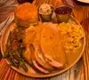 We made a reservation to eat dinner at Rustic Root for Thanksgiving because they were offering a Thanksgiving meal as well as their regular menu offerings. I’m not a huge traditional turkey kind of guy so I opted to order off the menu while my companion ordered the traditional turkey dinner. But wait, I’m getting ahead of myself….. First off, Rustic Root had three hosts up front when we arrived and they were smiling broadly and welcoming to us as we arrived at the restaurant. I let them know we had a reservation and they immediately were able to walk us to a dining room table. The restaurant was beautifully decorated for fall with leaves hanging from the ceiling throughout the premises. Chill EDM (electronic dance music) was playing at a moderate level and it was a festive scene in 80% full dining room. After sitting down we were quickly approached by our smiling waitress who took our drink order. Quick tip: Their Moscow Mule was really good. We also ordered a side of Brussels to share before our meal. For dinner we ordered the traditional Thanksgiving meal and the Bone-in Pork Chop. The roasted Brussels were really the only thing we weren’t crazy about during our visit. It wasn’t that they were horrible but the spicy honey made it a bit too sweet for our liking. The turkey dinner was absolutely humongous and came with corn, beans, cranberries, a biscuit, mashed potatoes and potato salad. My pork chop came with an amazing Demi-glaze. I subbed a jalapeño corn bread for the broccolini side and it also came with roasted sweet potatoes. The pork was beautifully cooked and the picture doesn’t really do it justice. It’s a good size meal. The sweet potatoes went well with the pork and I absolutely LOVED the corn bread. My mouth has started watering just thinking about it again. Looking forward to our next visit for sure!