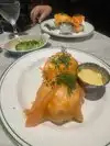 Go for the experience, stay for a few of the selections. NYC is not void of smoked fish options, so how do you choose. Other than go everywhere, there are some that are better than others. Since we have never been to Sadelles, it was a chance to check the box on the must-do list. We made a reservation for a cold Saturday morning and were seated within 5 minutes of our time. The tables are designed to maximize the number of people that can be served, smallish but they use every square inch plus the air rights above. They place a “tower” that you have seen used for cold seafood or two-tiers of pizza in the middle, and they place your plates on them. They also give each diner their own plate. The four of us started with a “Latke Royale with caviar.” This is an “order with your eyes wide open” since the price for one is $80 with the black caviar. The single palm sized latke is first topped with crème, then slices of smoked salmon, a good amount of black caviar and chives, dill and cucumber juliennes. One is plenty for four people to enjoy a sample, and enjoy we did. The combination of the components was unbelievable. One member of the party suggested a second but we all decided against since we had more food on its way. Our table ordered the house smoked salmon, the smoked Scottish salmon and the sable. Here is where I have an issue with Sadelles. When you order three $24 smoked fish platter, limiting the diner to a single palm-sized bagel is an affront. For a table of four, please bring a half a dozen bagels. The favorite was of the two salmons was the Scottish. This was perfectly smoked, delivered a healthy dose of salmon flavor and the texture was fantastic. The other two fishes were a distant second and third behind the Scottish. The house smoked salmon was barely smoked, if at all. I would best describe it a cold poached, there was no flavor other than cold salmon. While I did not like this one, one member of the table did, so it is a personal preference. The sable was not to my liking at all. This succulent fish was served much too salty, in fact I do not remember a saltier version anywhere. I would highly recommend tasting yours to see if it acceptable. We also ordered the cheese blintzes. The wrappers were delicious, with a mild sweetness and the filling was luscious, albeit a little scant. Again, I am always surprised when the server and the kitchen are not “out of the box” thinkers with customers. We had a table of 4, they serve three blitzes to an order. Why not ask if the table would like four blintzes for an addition $5-7 dollars. A perfect win-win. The bagels, although small, were delicious. They are made on site, in the middle of the restaurant and you can watch the process as you wait for your meal. I wish I had the option to enjoy more than one. Service was spot on throughout the meal. Overall, as much as I wanted to love Sadelles, but it just did not get to love. The Scottish salmon and latke were spectacular, the cheese blintzes delicious, but the House-Smoked and sable were not in the same league.