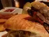 Outstanding large burger with sauteed mushrooms and onions and I improvised by putting goat cheese on it. Fries perfect and lobe how they do Caesar. Great service at bar too