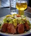 Went to the Saint Arnold Brewery for lunch today, Memorial Day. Was a fixed menu, either a Chicago Hot Dog, or pulled pork sandwich. We chose pulled pork. Came with a jamica salad, potato salad, and sandwich with coleslaw. Salad was pretty good. Potato salad was made with way too much Creole-Style mustard. The sandwich was not edible for me--though my husband did eat his. Big chunks of fat in the pulled pork--and the flavor was way too perfumed! Can't figure out what that spice was--but it was not good! Clearly, from the look on faces of those sitting around us--they shared our opinion! The beer was great, the service was good, staff friendly. Someone near us said she had eaten there before and the food was great. May try again..once more. It was expensive for what we got--$20 per person.