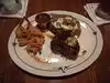 Our group had a variety of items and all were good. Mushrooms and medallions - very good Ribs and shrimp - Excellent Chicken fried steak - Good (more late) Salmon - tasty We went for lunch on a Sunday. The place was slowly filling up, but not crowded. The staff was pleasant and everyone greeted us when we entered. Overall, everything was ok. The food was good, the portions were good size and the service was fine. The only criticism relates tot he server checking tthat what he brings to the table is matching what was ordered. For example: My chicken fried steak was huge, but was served without any gravy! Who serves something like this without lots of gravy? I had to request gravy twice and then ask for more when they brought out a tiny cup of gravy. I know this sounds picky, but come on...it was a chicken fried steak!! The portions for all dishes were good size. The lunch menu is not available on the weekends, so dinner portions and dinner prices. Not much is less than $15.99 plus $3 drink plus tax and tip. The bill for three of us without dessert was $85 for a lunch!! Overall good food, but procey!