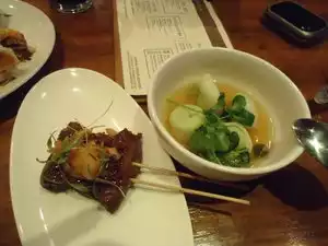 Food was mediocre and portions tiny. Wagyu beef and chicken skewers were chewy and very salty. Tempura cauliflower and dumplings were ok.
