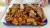 Large trays of shrimp with garlic bread. Fried fish everywhere. Seafood! Seafood! It is overwhelming for your first time and the wait time can be be long but in the end its worth it.