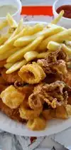 Ordered from the fast food section. The oil that cooked the fish was old, resulting in an orange colour and funny tasting fish. Fries were cold and soggy. Surprised that a fish & chip place cannot get chips right Lovely atmosphere though on the water