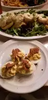 Lovely evening last Saturday so sat outside, partially covered. We ordered the devilled eggs with praline bacon. Tasty but the smallest eggs. Should use large eggs. We ordered meatloaf, nice, chicken & sausage gumbo, crawfish cheese bread and crawfish etouffe. All were tasty except that the etouffe was cold and requested to be heated. Hot it was good. This was done and the waiter explained when the bill came that there was no charge for the etouffe. Very decent. The sides, fried okra and corn weren't worth ordering. Not tasty.