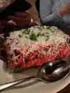 Perfect table/booth combo with view of the outstanding floor to ceiling bar. Fixed menu $65pp provided plenty of excellent dishes to share Calamari 9/10 unusual prep with black ink excellent. Very crisp- Eggplant parmigiana 8.7/10 no bread perfect flavor Maccheroni pasta 9/10 served hot and pasta cooked just right Italian cold cuts 8/10 plenty of qty great olives Steak tartare 7/10 thick chunks and to chewy. Flavor ok Branzino 6/10 taste was great but lots of bones. Yes, whole fish but usually bones are removed. This was dangerous. Steak 8/10 choice cut below, flavors decent, just ok Zeppole 10/10 light and flavorful Affogato 10/10 perfect texture and coffee flavor Great staff and room. Half the group enjoyed the speakeasy after dinner and enjoyed the cool vibe and seats for everyone. Highly recommend Valet parking